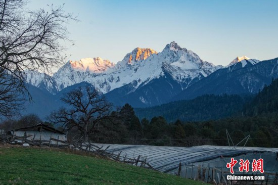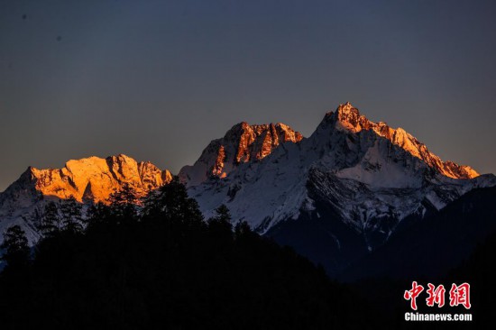 12月17日,夕陽照在西藏自治區(qū)林芝市波密縣境內(nèi)的雪山頂上,出現(xiàn)“日照金山”的景象。林芝被譽(yù)為“雪域江南”,境內(nèi)雪山巍峨、峽谷幽深、森林廣布,生態(tài)環(huán)境極為純凈,兼具山、水、林、草、湖、雪、冰之美,是絕佳的旅游勝地。也是川藏公路上風(fēng)光最美的一段。中新社記者 貢嘎來松 攝
